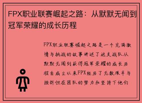 FPX职业联赛崛起之路:从默默无闻到冠军荣耀的成长历程
