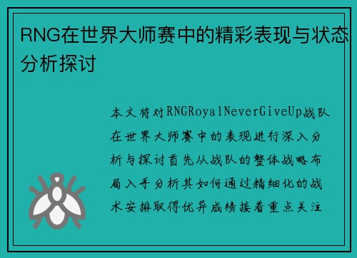 RNG在世界大师赛中的精彩表现与状态分析探讨